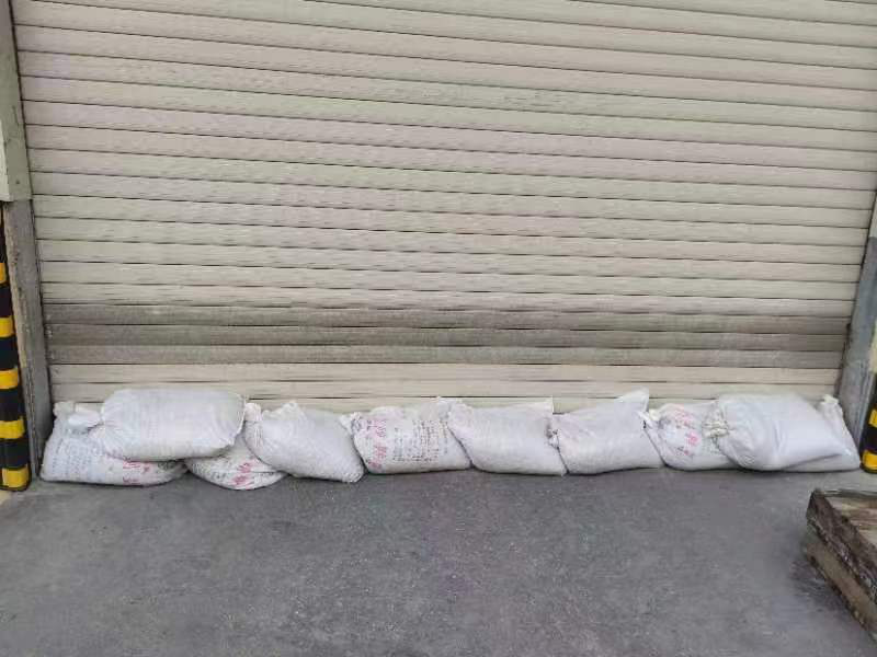 (圖為泉州鹽業(yè)配送中心倉庫準(zhǔn)備應(yīng)急防汛沙袋,對倉庫卷閘門進(jìn)行防水防堵。)