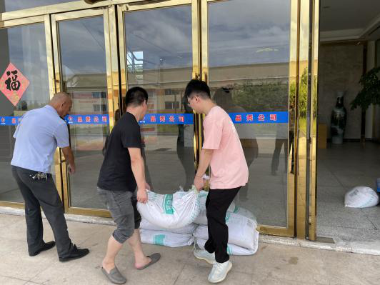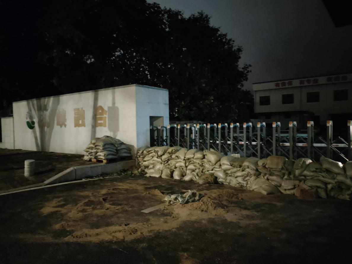 (圖為晶海輕化搶險黨員突擊隊(duì)緊急堆疊沙袋堵漏,并轉(zhuǎn)移包裝物)