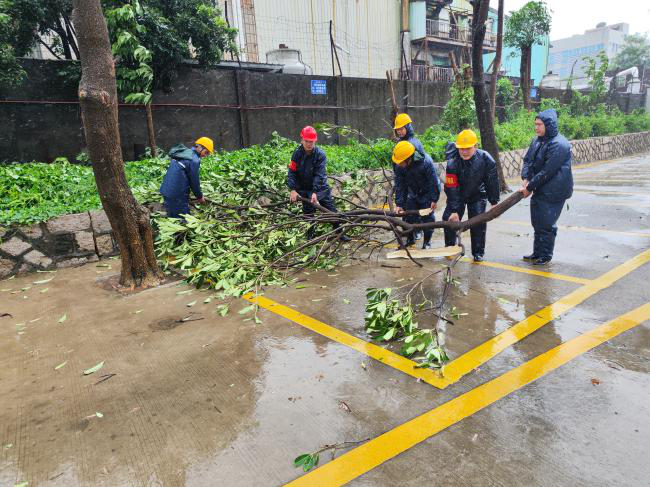 (圖為泉州融合黨員突擊隊(duì)排查風(fēng)險隱患,及時清理倒塌的樹枝)