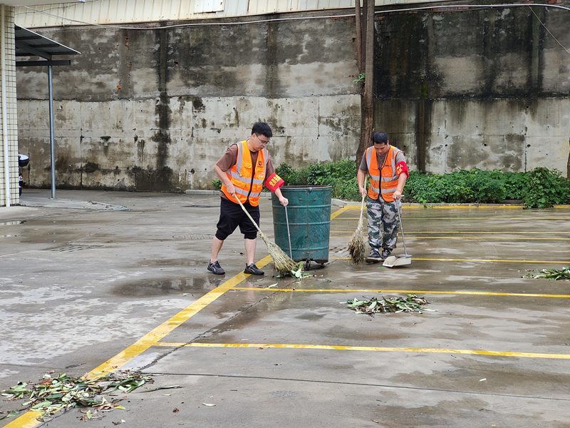 (圖為廈門融合突擊隊(duì)清掃臺風(fēng)席卷后的園區(qū))