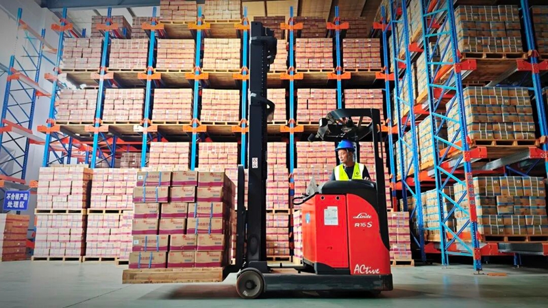 (省級(jí)食鹽儲(chǔ)備庫內(nèi),叉車正在有序作業(yè),彰顯現(xiàn)代化保供能力)