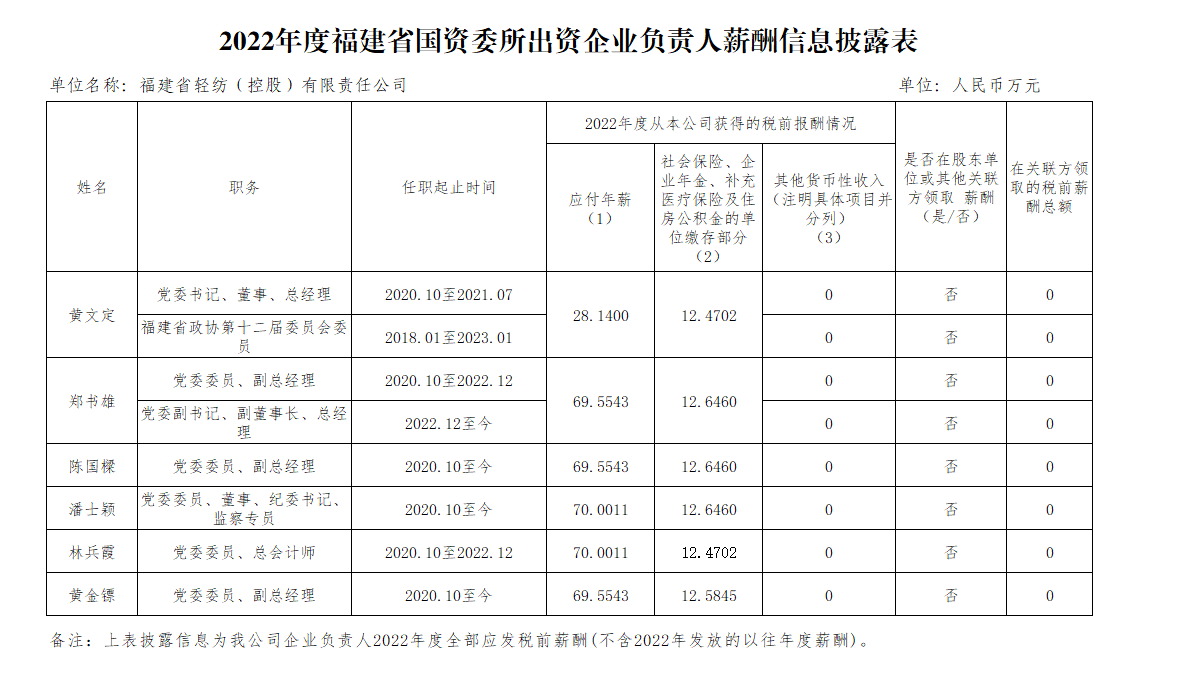 福建省國(guó)資委所出資企業(yè)負(fù)責(zé)人2022年度薪酬信息披露表
