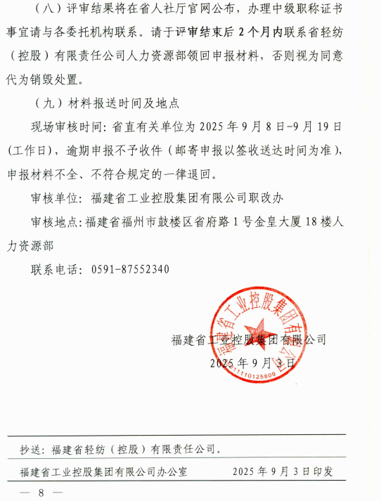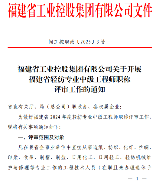 福建省工業(yè)控股集團(tuán)有限公司關(guān)于開展 福建省輕紡專業(yè)中級工程師職稱 評審工作的通知
