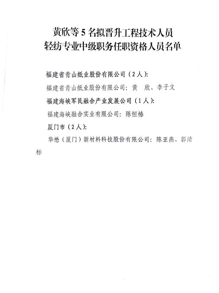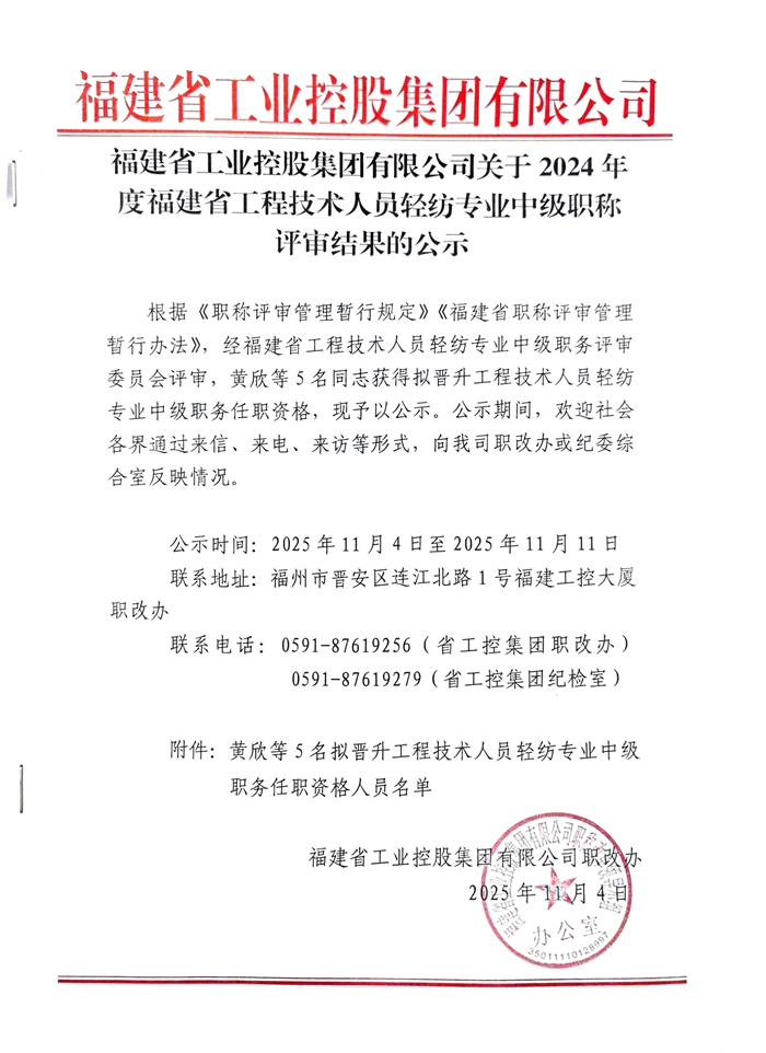 福建省工業(yè)控股集團有限公司關(guān)于2024年度福建省工程技術(shù)人員輕紡專業(yè)中級職稱評審結(jié)果的公示