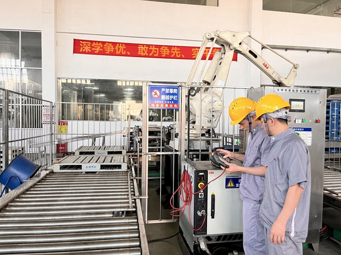 機修人員在調(diào)整碼垛機械手疊垛程序