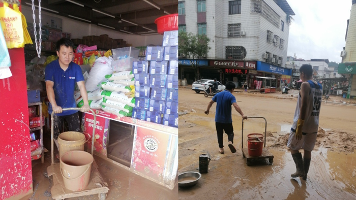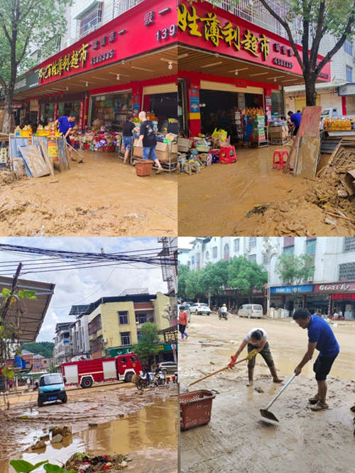 17日晨,隨著洪水逐漸退去,大量淤泥、垃圾聚集,鄉(xiāng)鎮(zhèn)街道兩旁的沿街店鋪滿目狼藉,商戶們忙于轉(zhuǎn)移物資、清理積水和淤泥。此次災(zāi)情導(dǎo)致龍巖鹽業(yè)多個(gè)客戶的店鋪被淹,鹽產(chǎn)品等物資財(cái)產(chǎn)受到較大程度損失。