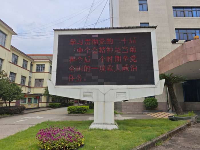 青山紙業(yè)門(mén)口LED大屏幕滾動(dòng)播放黨的二十屆三中全會(huì)宣傳標(biāo)語(yǔ)