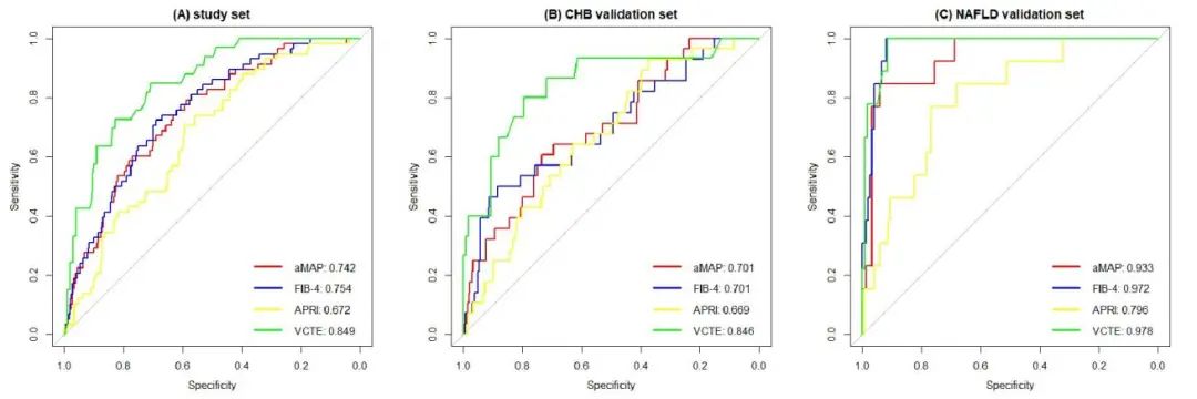 結果表明,CHB和NAFLD患者中肝硬化占比分別為10.0%和8.1%。在研究組,aMAP評分診斷肝硬化的AUC為0.742,與FIB-4(0.754)和APRI(0.672)相當(P>0.05)。在CHB驗證組獲得了類似結果,而在NAFLD驗證組中,aMAP評分診斷肝硬化的AUC高達0.933,與FIB-4相當(0.972,P>0.05)并且顯著高于APRI(0.796,P<0.05)(圖1)。<>
